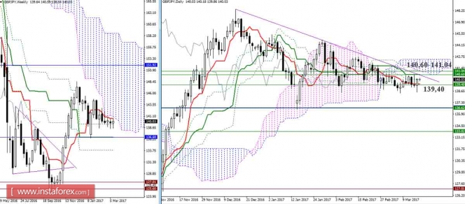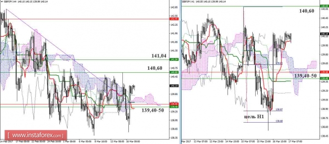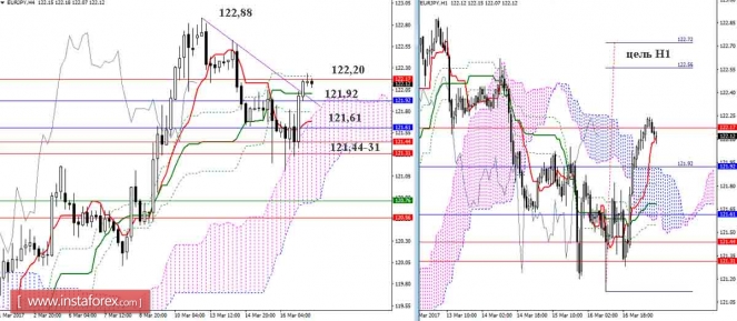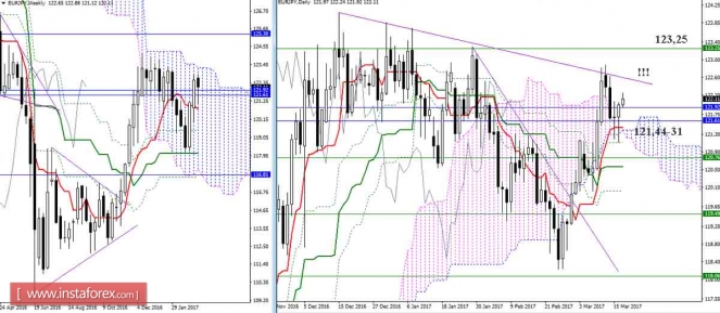 Уровни поддержки и сопротивления – красные горизонтальные линии.Материал предоставлен компанией InstaForex - www.instaforex.comДневной обзор GBP/JPY и EUR/JPY на 17.03.17. Индикатор Ишимоку