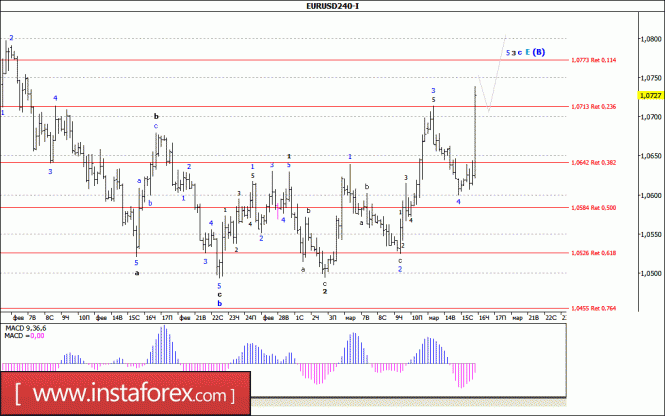 Валютная пара продолжает построение восходящего набора волн. Если это предположение верно, то повышение котировок продолжится в рамках волны 5, в 3, в с, в E, в (B) с целями, расположенными около расчетной отметки 1,0773, что соответствует 11,4% по Фибоначчи, и выше около 8 фигуры. В рамках коррекционной волны 4, в с, в E, в (B) понижение котировок может начаться с целями, находящимися около отметок 1,0641 и 1,0584, что приравнивается к 38,2% и 50,0% по Фибоначчи.Материал предоставлен компанией InstaForex - www.instaforex.com