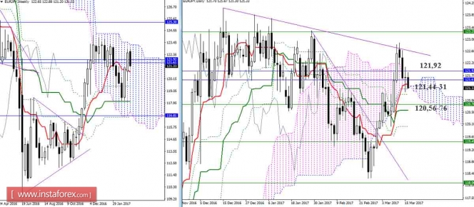 В прошлые сутки не удалось реализовать полноценный отбой от поддержек. Сформированный дневной Дожи говорит о слабости игроков на повышение. Сегодня мы наблюдаем новую попытку преодолеть дневное облако (121,31) и дневной Тенкан (121,44), надёжное закрепление ниже способно изменить планы игроков на повышение.