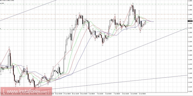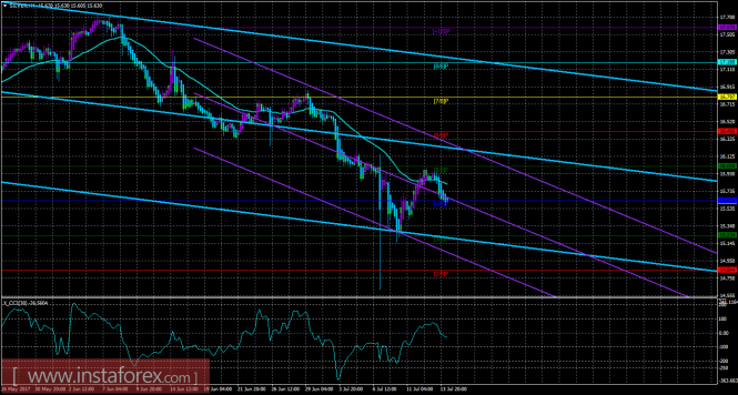 Курс фунта стерлингов 14 июля возобновил восходящий тренда, закрепившись выше скользящей средней линии. Старший канал развернулся вниз, что свидетельствует о нисходящем направлении глобального тренда. Младший канал развернулся наверх, что означает восходящее направление движения в менее долгосрочном плане. Цена сейчас находится выше уровня Мюррея «4/8», а также выше скользящей средней, что говорит в пользу восходящей тенденции. Текущей целью восходящего движения является уровень Мюррея «5/8» - 1,3000. Если этот таргет будет преодолен, то новой актуальной целью будет уровень Мюррея «6/8» - 1,3062. Индикатор Хайкен Аши окрасил последние бары в фиолетовый цвет, что свидетельствует о локальном восходящем движении, разворот индикатора обратно вниз укажет на новый виток коррекционного движения, а лонги станут временно не доступными для открытия. Скользящая средняя направлена вверх, а цена в свою очередь находится выше нее, поэтому сейчас более актуальна восходящая тенденция. Короткие позиции можно будет рассматривать только после закрепления цены ниже мувинга и разворота вниз хотя бы одного канала. Индикатор CCI находится около уровня 200, что обозначает сильную перекупленность валютной пары, ожидается нисходящий откат.