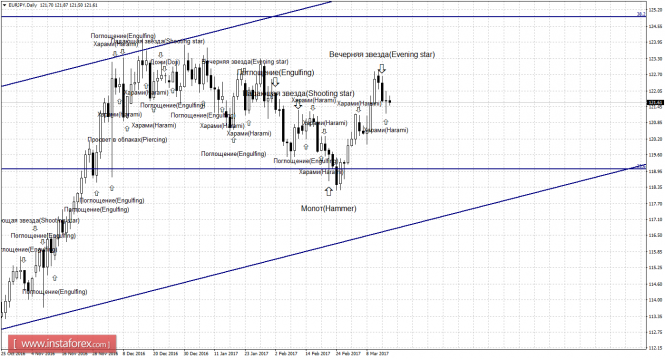 После образования бычьей формации «Харами» на 4-часовом графике котировки выполнили возврат к уровню коррекции 100,0% - 122,00 и отбой, который позволил выполнить разворот в пользу японской иены и продолжить процесс падения в направлении коррекционного уровня 76,4% - 119,06. Образование 16 марта бычьей формации позволит трейдерам вновь ожидать разворот в пользу валюты ЕС и еще один возврат к уровню коррекции 100,0%. Такая формация будет трактоваться как коррекционная. Закрепление курса пары над уровнем Фибо 100,0% повысит шансы на продолжение роста в направлении следующего уровня коррекции 161,8% - 129,68.