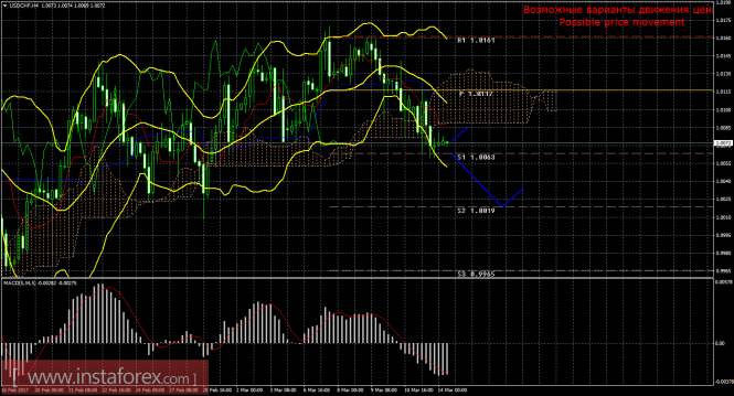 Красная линия и гистограмма с белыми барами в окне индикаторов.Материал предоставлен компанией InstaForex - www.instaforex.comТехнический анализ и торговые рекомендации по валютной паре USD/CHF на 14 марта 2017 года