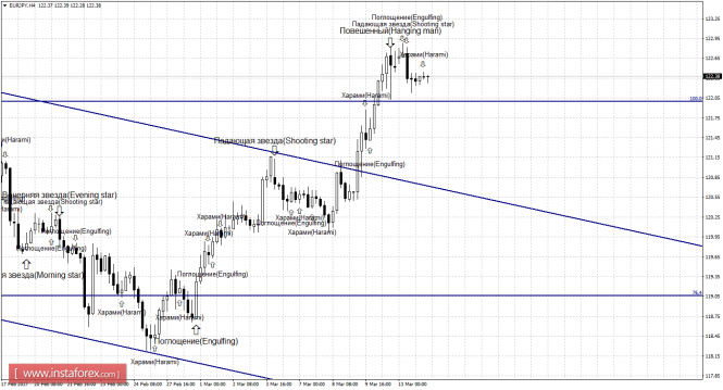 После образования еще двух медвежьих формаций «Падающая звезда» и «Поглощение» сразу и «Харами» чуть позже, пара выполнила разворот в пользу валюты Японии и начала процесс падения в направлении коррекционного уровня 100,0% - 122,00. Закрепление котировок 14 марта под уровнем Фибо 100,0% позволит рассчитывать трейдерам на продолжение падения в направлении следующего уровня коррекции 76,4% - 119,06. Образование бычьей свечной формации позволит ожидать разворот в пользу европейской валюты и некоторый рост пары в направлении коррекционного уровня 161,8% - 129,69.