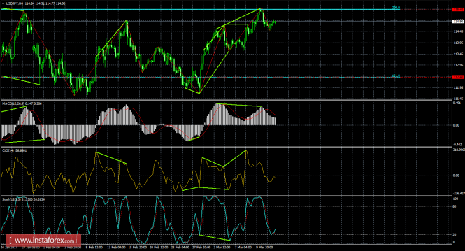 Медвежья дивергенция и отбой пары от уровня коррекции 200,0% - 115,42 на 4-часовом графике позволили выполнить разворот в пользу японской валюты и начать падение в направлении уровня Фибо 161,8% - 112,40. Медвежья дивергенция у индикатора MACD: последний пик котировок получился выше предыдущего, а аналогичный пик индикатора - ниже предыдущего. Назревающих дивергенций 14 марта не видно. Закрепление котировок над коррекционным уровнем 200,0% сработает в пользу доллара США и возобновления роста пары в направлении следующего уровня коррекции 261,8% - 120,37, а также отменит дивергенцию.