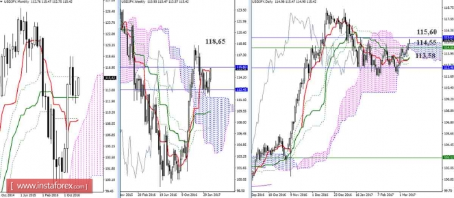 Благодаря формированию февральского Дожи, игроки на повышение пользуются ситуацией, восстанавливая позиции. В настоящий момент первой задачей для них является избавление от сопротивления дневного облака, которое усилено месячным Фибо Киджуном (115,60). Закрепление выше данных сопротивлений сформирует возможности для подъёма к максимальному экстремуму действующей коррекции (118,65). Ближайшие поддержки сейчас сосредоточены в районе дневного облака и недельного Тенкана (114,55), далее следует дневной крест (113,58).