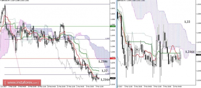 Пара исполнила цель на пробой облака Н4 и закрепилась ниже, но покинуть зону влияния и притяжения цели Н4 игрокам на понижение не удаётся, в результате в настоящий момент формируются предпосылки для восходящей коррекции. Закрепление выше 1,2164 (Тенкан Н4 + Киджун Н1) позволит рассмотреть подъём в район 1,22 (Киджун Н4 + верх облака Н1), преодоление данного рубежа откроет дорогу к сопротивлению облака Н4, усиленного сейчас дневным Тенканом (1,2306).