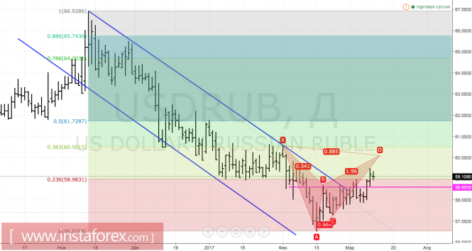Технически многое в паре USD/RUB будет зависеть от способности «быков» удержать котировки выше уровня 59. Если им это удастся, то возрастут риски реализации таргета на 88,6% по перевернутому паттерну «Летучей мыши».