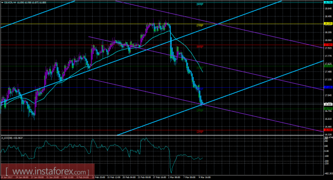 Из анализа серебра 10 марта следует, что цена продолжает движение вниз без каких-либо признаков начала коррекционного движения. Старший канал направлен вверх, что свидетельствует о восходящем направлении движения глобального тренда. Младший канал развернулся вниз, что означает нисходящее движение и в менее долгосрочном плане. В данный момент цена находится ниже мувинга и ниже уровня Мюррея «4/8», что делает более вероятным продолжение нисходящего движения. Первой целью для движения вниз сейчас является уровень Мюррея «3/8» - 16,797. Если цена преодолеет этот уровень, то новой целью будет выступать уровень Мюррея «2/8» - 16,406. Скользящая средняя направлена вниз, а цена располагается ниже нее, что сигнализирует о текущем нисходящем направлении движения. Ордера на покупку станут актуальными только выше мувинга. Хайкен Аши окрасил последние бары в голубой цвет, что сигнализирует о внутридневном движении вниз, таким образом, до разворота индикатора вверх открытые шорты можно сопровождать. Окрас 1-2 баров в фиолетовый цвет укажет на виток коррекции. Индикатор CCI находится около уровня -100, что сигнализирует о слабой перепроданности инструмента, по-прежнему ожидается восходящая коррекция.
