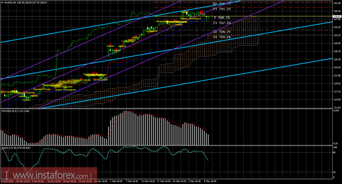 Анализируя акции компании Apple 10 марта, видим, что цена отработала линию Киджун-сен и может отскочить от нее и возобновить восходящий тренд. Текущий «золотой крест» остается сильным (так как цена располагается выше облака), поэтому длинные позиции индикатор Ишимоку разрешает рассматривать. Старший канал линейной регрессии направлен вверх, младший канал также направлен вверх, поэтому лонги актуальны и по этому признаку. Целью для восходящего движения инструмента является уровень сопротивления 141,22. Второй целью для движения вверх выступает 142,71. Новых свечных моделей на данный момент нет. MACD направлен вниз, сигнализируя о коррекционном движении, разворот индикатора обратно вверх указать на окончание нисходящей коррекции. Стохастик покинул область перекупленности, что сейчас свидетельствует о нисходящем настроении участников рынка. Отскок цены от критической линии может спровоцировать окончание витка коррекции. Младший таймфрейм детализирует картину старшего таймфрейма. На младшем графике видно, что цена отработала линию Киджун-сен и не смогла ее преодолеть, а также ушла выше линии Тенкан-сен. Ордера на покупку, таким образом, сейчас актуальны с целью уровень сопротивления 141,22, но коррекция может возобновиться, о чем может просигнализировать разворотом вниз индикатор MACD.