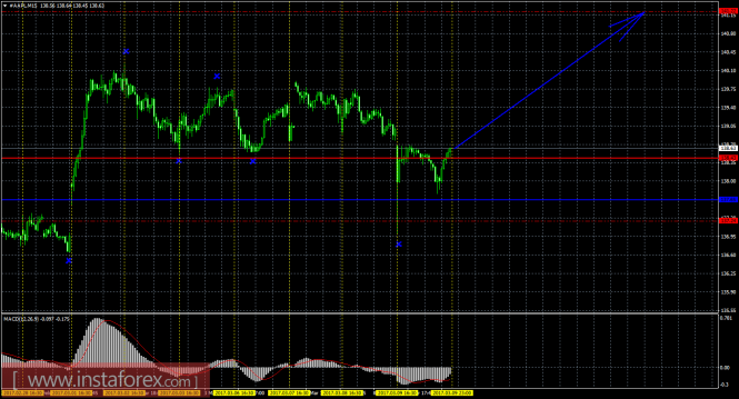 На 15-минутном графике рекомендуется рассматривать ордера на покупку с целью 141,22, при закреплении цены выше Тенкан-сен (138,43), ордером Stop Loss ниже 138,43. Разворот MACD вниз укажет на новый виток локальной коррекции.