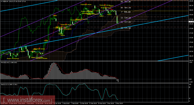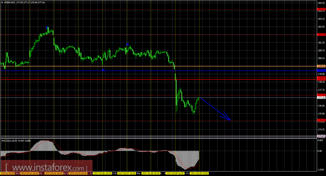 На младшем графике рекомендуется рассматривать ордера на продажу с целью 175,43, при открытии ниже 177,35, ордером Stop Loss выше 177,35 и при направленном вниз индикаторе MACD.