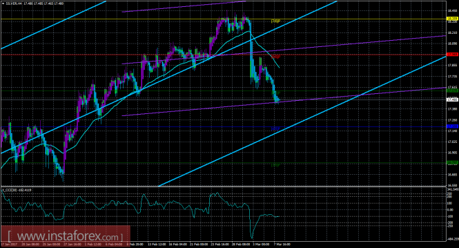 Индикатор MACD – красная линия и гистограмма с белыми барами в окне индикаторов.Материал предоставлен компанией InstaForex - www.instaforex.comТехническая картина инструмента SILVER по системе «Каналы регрессии» за 8 марта 2017 года