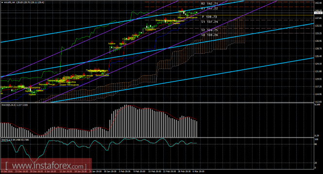 Анализируя акции компании Apple 8 марта, видно, что цена продолжает боковое коррекционное движение, а индикатор MACD продолжает разряжаться. Текущий «золотой крест» является сильным (так как цена располагается выше облака), поэтому длинные позиции индикатор Ишимоку разрешает рассматривать. Старший канал линейной регрессии направлен вверх, младший канал – также направлен наверх, поэтому лонги актуальны и по этому признаку. Целью для восходящего движения инструмента является уровень сопротивления 141,22. Второй целью для движения вверх выступает 142,71. Медвежья модель «Харами» указала на начало коррекции, а бычья модель «Поглощение» сигнализирует о его возможном завершении. MACD направлен вниз, сигнализируя о коррекционном движении, разворот индикатора обратно наверх указать на завершение коррекции. Стохастик находится в области перекупленности, что сейчас свидетельствует о восходящем настроении участников рынка и слабости коррекции. Младший таймфрейм детализирует картину старшего таймфрейма. На младшем графике видно, что цена по-прежнему располагается выше линии Тенкан-сен. Ордера на покупку, таким образом, сейчас сохраняют свою актуальность с целью уровень сопротивления 141,22. Разворот MACD наверх может просигнализировать о завершении витка локальной коррекции.