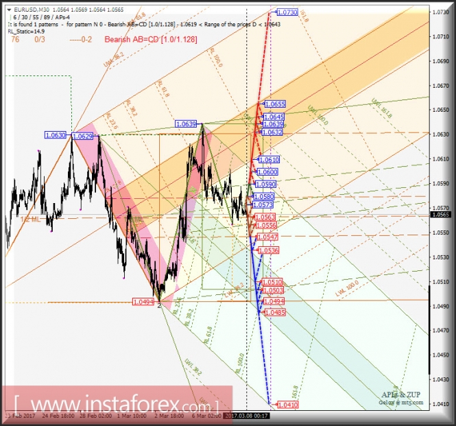 Развитие движения цены инструмента (EUR/USD) в период 08_09 марта 2017 г. будет обусловлено отработкой границ каналов 1/2 Median Line вил операционных масштабов -> SubMinuette (1.0547 <-> 1.0563 <-> 1.0580) и Micro (1.0556 <-> 1.0573 <-> 1.0590).