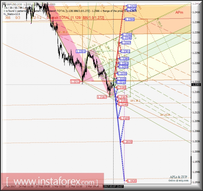 Развитие движения цены инструмента (GBP/USD) в период 08_09 марта 2017 г. будет обусловлено отработкой границ канала 1/2 Median Line (1.2195 <-> 1.2210 <-> 1.2220) вил операционного масштаба Micro.