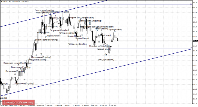 Несильная медвежья свечная формация «Харами» позволила котировкам выполнить разворот в пользу японской иены и начать падение в направлении коррекционного уровня 23,6% - 119,07. Образование бычьей формации будет являться трендовым сигналом, так как равноудаленный канал имеет направление «вверх», и позволит ожидать разворот уже в пользу европейской валюты и возобновление роста пары в направлении уровня коррекции 38,2% - 124,91. Закрепление курса под уровнем Фибо 23,6% повысит вероятность дальнейшего падения в направлении следующего уровня коррекции 0,0%.
