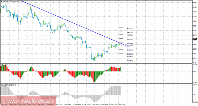 Красная линия и гистограмма с белыми барами в окне индикаторов.Материал предоставлен компанией InstaForex - www.instaforex.comТехнический анализ природного газа за 6 марта 2017 года