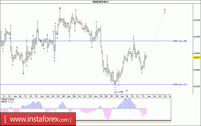 В целом ожидаемо, пятничные торги пара USD/CHF начала с восходящего движения и, прибавив в цене около 55 п.п., во второй половине дня пробила отметку 0,9650. При этом можно предположить, что в результате такого роста котировок, валютная пара предприняла попытку завершить 2-ю волну, в составе будущей волны С и перейти в стадию формирования 3-й волны, в этой С. Если это так, то у валютной пары могут появиться неплохие перспективы для дальнейшего развития восходящего движения к отметке 0,9750, или к уровню 98-й фигуры.