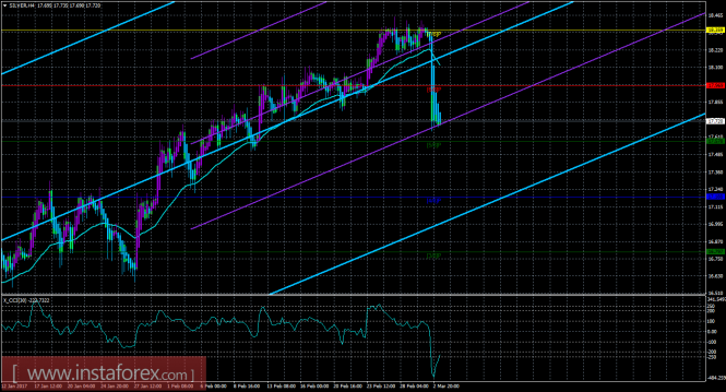 Индикатор MACD - красная линия и гистограмма с белыми барами в окне индикаторов.Материал предоставлен компанией InstaForex - www.instaforex.comТехническая картина инструмента SILVER по системе «Каналы регрессии» за 3 марта 2017 года