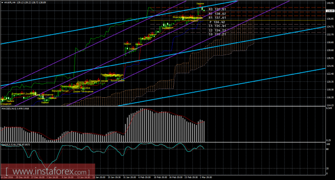 Анализируя акции компании Apple 3 марта, видим, что цена не смогла преодолеть последний уровень сопротивления и отскочила от него. Текущий «золотой крест» является сильным (так как цена располагается выше облака), поэтому длинные позиции индикатор Ишимоку разрешает рассматривать. Старший канал линейной регрессии направлен вверх, младший канал также направлен вверх, поэтому лонги актуальны и по этому признаку. Целью для восходящего движения инструмента остается третий уровень сопротивления 139,81, который уже был достигнут. «Медвежья» модель «Харами» указала на начало коррекции. MACD направлен вверх, сигнализируя уже о восходящем движении, разворот индикатора вниз может подтвердить виток нисходящей коррекции. Стохастик вернулся в область перекупленности, что сейчас свидетельствует о восходящем настроении участников рынка и слабости коррекции. Отскок цены от линии Киджун-сен может спровоцировать возобновление восходящего тренда. Младший таймфрейм детализирует картину старшего таймфрейма. На младшем графике видно, что цена по-прежнему располагается выше линии Тенкан-сен и отработала последний таргет. Лонги сейчас сохраняют свою актуальность при закреплении выше уровня 138,63 с целью уровень сопротивления 139,81. Разворот MACD вверх может просигнализировать об окончании локальной коррекции.