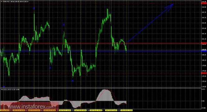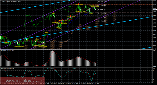 На младшем графике рекомендуется рассматривать ордера на покупку с целью 182,77, при открытии выше 180,90 (Тенкан-сен), ордером Stop Loss ниже 180,90 и при направленном вверх индикаторе MACD.