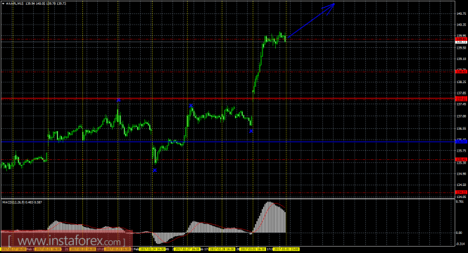 На 15-минутном графике рекомендуется рассматривать ордера на покупку, при закреплении цены выше 139,81, ордером Stop Loss ниже 139,81. MACD при этом должен быть направлен вверх.