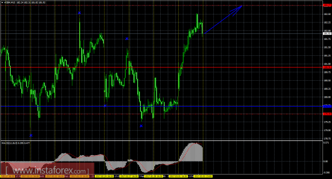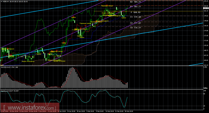 На младшем графике рекомендуется рассматривать ордера на покупку с целью 182,77, при открытии выше 180,90 (Тенкан-сен), ордером Stop Loss ниже 180,90 и при направленном вверх индикаторе MACD.