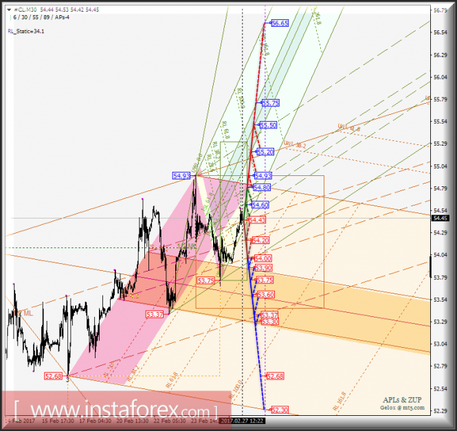 Развитие движения цены инструмента (#CL) в период 27_28 февраля 2017 г. будет обусловлено отработкой границ каналов 1/2 Median Line вил операционных масштабов -> Micro (54.43 <-> 54.60 <-> 54.80) и SubMinuette (54.43 <-> 54.20 <-> 54.00).