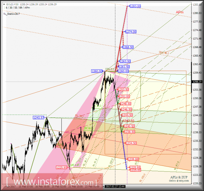 Развитие движения цены инструмента (Gold Spot) в период 27_28 февраля 2017 г. будет обусловлено отработкой уровня сопротивления 1260.00 (текущий maximum) и верхней границы канала 1/2 Median Line (уровень поддержки 1253.50) вил операционного масштаба Micro.