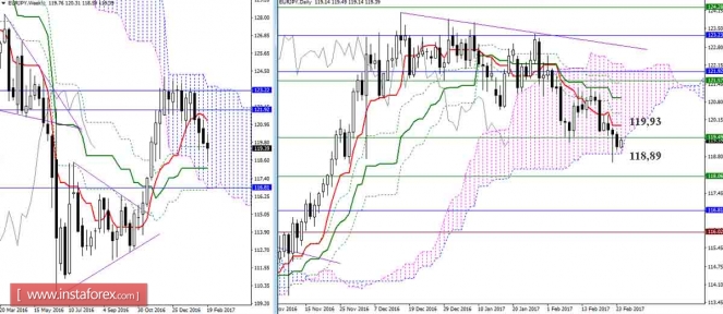 Развить коррекционный подъём вчера не получилось, но и выйти за пределы нижней тени (свеча 22.02.17.) не удалось. Предпосылки для развития коррекции сохраняются, ближайшим ориентиром и сопротивлением является дневной Тенкан (119,93). Поддержкой служит нижняя граница дневного облака (118,89).