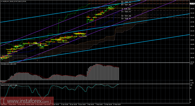 Анализируя акции компании Apple 23 февраля, видим, что цена продолжает несильное восходящее движение и отработала первый таргет. Текущий «золотой крест» является сильным (так как цена располагается выше облака), поэтому длинные позиции индикатор Ишимоку разрешает рассматривать. Старший канал линейной регрессии направлен вверх, младший канал также направлен вверх, поэтому ордера на покупку актуальны и по этому признаку. Целью для восходящего движения инструмента является первый уровень сопротивления 137,01, который уже достигнут. Второй целью для движения вверх выступает уровень сопротивления 138,36. Сформировалась новая «бычья» модель «Харами», которая поддерживает движение вверх. MACD по-прежнему направлен вниз, продолжая разряжаться, так как цена при этом не понижается. Стохастик находится в области перекупленности, что сейчас свидетельствует о восходящем настроении участников рынка и отсутствии коррекции. Отскок цены от уровня 137,01 может спровоцировать виток коррекционного движения. Младший таймфрейм детализирует картину старшего таймфрейма. На младшем графике также видно, что цена по-прежнему располагается выше линии Тенкан-сен и сохраняет перспективы движения вверх. Лонги сейчас сохраняют свою актуальность с целью уровень сопротивления 138,36, при закреплении цены выше уровня 137,01.