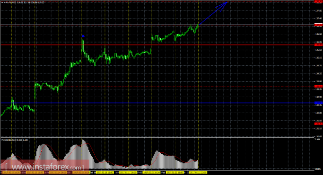 На 15-минутном графике рекомендуется рассматривать ордера на покупку с целью 138,36, при закреплении цены выше 137,01, ордером Stop Loss ниже 137,01. Индикатор MACD сейчас часто разряжается.