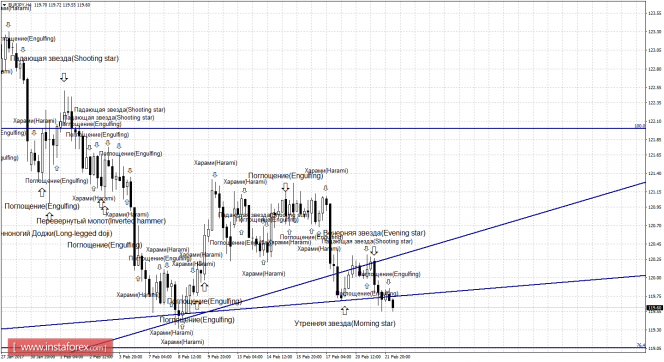 Сильная медвежья формация «Вечерняя звезда» и слабая «Поглощение», образовавшиеся на 4-часовом графике сработали в пользу японской иены. Началось и продолжается 22 февраля падение котировок в направлении уровня коррекции 76,4% - 119,06. Образование бычьей свечной формации позволит рассчитывать на разворот в пользу валюты ЕС и некоторый рост пары в направлении уровня Фибо 100,0% - 122,00. Отбой котировок от уровня коррекции 76,4% аналогично позволит ожидать некоторый рост пары. Закрепление курса под уровнем Фибо 76,4% повысит вероятность дальнейшего падения в направлении следующего коррекционного уровня 61,8% - 117,24.