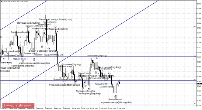 Бычьи формации «Харами» (априори слабая) и «Утренняя звезда» (сильная), образовавшиеся на 4-часовом графике, позволили паре выполнить разворот в пользу валюты Новой Зеландии и рост к уровню коррекции 50,0% - 0,7172. Отбой пары 22 февраля от уровня Фибо 50,0% позволит ожидать разворот в пользу американской валюты и некоторое падение в направлении коррекционного уровня 38,2% - 0,7099. Образование медвежьей свечной формации повысит шансы пары на отбой от уровня коррекции 50,0%. Закрепление котировок над уровнем Фибо 50,0% повысит вероятность дальнейшего роста в направлении уровня коррекции 61,8% - 0,7246.