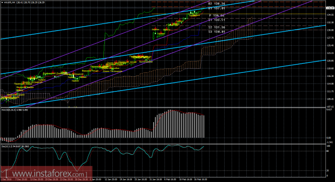 Анализируя акции компании Apple 22 февраля, видим, что цена продолжает восходящий тренд, а индикатор MACD продолжает разряжаться. Текущий «золотой крест» является сильным (так как цена располагается выше облака), поэтому длинные позиции индикатор Ишимоку разрешает рассматривать. Старший канал линейной регрессии направлен вверх, младший канал также направлен вверх, поэтому ордера на покупку актуальны и по этому признаку. Целью для восходящего движения инструмента является первый уровень сопротивления 137,01. Второй целью для движения вверх выступает уровень сопротивления 138,36. Сформировалась новая «бычья» модель «Харами», которая поддерживает движение вверх. MACD направлен вниз, продолжая разряжаться, так как цена не понижается. Стохастик находится в области перекупленности, что сейчас свидетельствует о восходящем настроении участников рынка и отсутствии коррекции. Отскок цены от уровня 137,01 может спровоцировать коррекционное движение. Младший таймфрейм детализирует картину старшего таймфрейма. На младшем графике также видно, что цена по-прежнему располагается выше линии Тенкан-сен и сохраняет перспективы движения вверх. Лонги сейчас сохраняют свою актуальность с целью уровень сопротивления 137,01, при расположении цены выше Тенкан-сен.