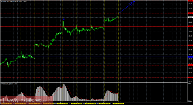 Цена акций Apple продолжает движение вверх. На текущем графике рекомендуется рассматривать длинные позиции с целью 137,01. В случае преодоления этого уровня, таргетом будет выступать 138,36. Закрывать ордера на покупку рекомендуется в случае формирования «медвежьей» модели (с подтверждением), при отскоке цены от первого таргета или при развороте индикатора MACD вниз (при параллельном понижении цены). Стоп лосс при торговле на повышение выставляем ниже критической линии 132,26. Ордера на продажу сейчас не актуальны.