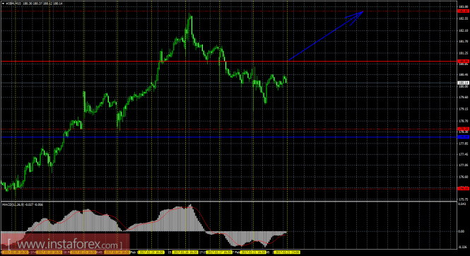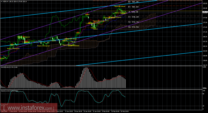 На младшем графике рекомендуется рассматривать ордера на покупку с целью 182,82, при открытии выше 180,94 (Тенкан-сен), ордером Stop Loss ниже 180,94. Индикатор MACD при этом должен быть направлен вверх.