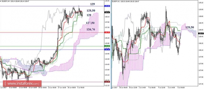 Вчера после очередного тестирования 129, пара вернулась под 128,50 (Тенкан Н4 + облако Н1), передав тем самым начальное преимущество на младших таймах игрокам на понижение, но преодолеть важную поддержку на 128 медведям так и не удалось. Сегодня всё начинается сначала. Возврат на сторону быков 128,50 откроет дорогу к 129, а закрепление под 128 увеличит шансы на развитие коррекционного снижения, ориентирами которого сейчас выступают 127,50 (верхняя граница облака Н4) и 126,76 (дневной Тенкан).