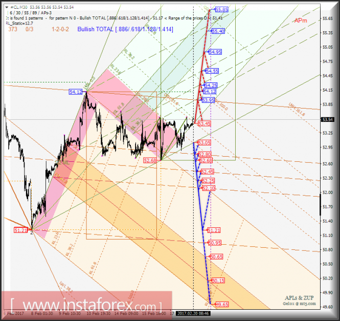 Развитие движения цены инструмента (#CL) в период 20_21 февраля 2017 г. будет обусловлено отработкой начальной линии SSL (уровень сопротивления 53.45) вил операционного масштаба Micro и контрольной линии LTL Micro (уровень поддержки 53.05).