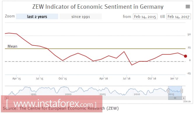 Институт ZEW отмечает замедление экономической активности. Индекс настроений в деловой среде составил в феврале 10.4.п, это заметно меньше 16.6п месяцем ранее, для зоны евро в целом также отмечено охлаждение с 23.2п до 17.1п.
