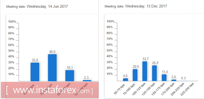 Также Йеллен отметила, что рынок труда продолжает укрепление, а инфляция движется к таргету 2%. Йеллен никак не дала понять, считает ли она трехкратное повышение ставки в текущем году вероятным или ФРС ограничится двумя повышениями, однако рынок свои выводы сделал, и в настоящее время повышение ставки в июне выглядит делом практически решенным, а второе повышение игроки ждут в декабре. Вероятность трехкратного повышения ставки в текущем году рынком после вчерашнего выступления расценивается более чем в 40%.