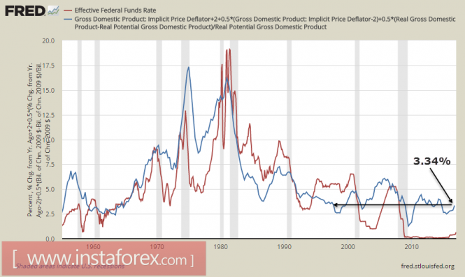 Именно Тэйлор разработал в свое время формулу, которая связывает ставку по федеральным фондам, с одной стороны, и темпы роста ВВП и инфляция, с другой. Согласно этой формуле, текущий уровень ставок неоправданно низок, поскольку расчетное значение равно 3.34%.