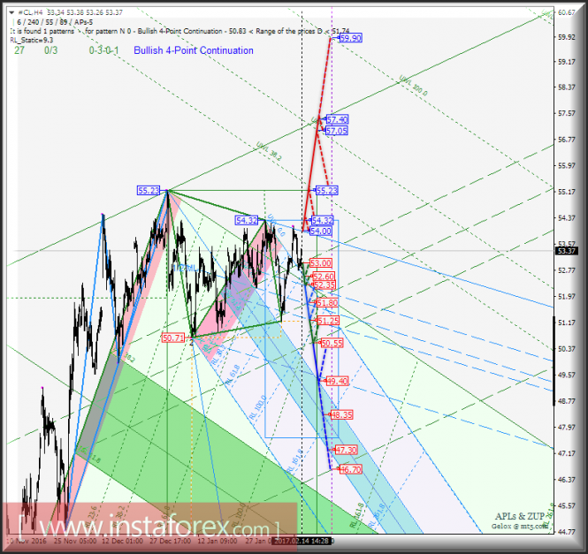 Развитие движения цены инструмента (#CL) в период 15_28 февраля 2017 г. будет обусловлено отработкой контрольной линии UTL (уровень сопротивления 54.00) вил операционного масштаба Minuette и верхней границы канала 1/2 Median Line (уровень поддержки 53.00) вил операционного масштаба Minute.
