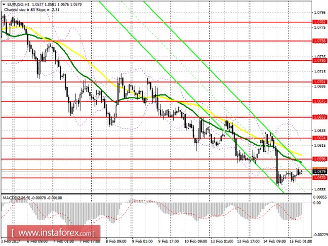Уровень 1.0564, на который я советовал обратить внимание, оказался хорошей поддержкой после вчерашних заявлений Джанет Йеллен о возможном повышении ставок уже на мартовском заседании. В настоящее время промежуточной поддержкой выступает область 1.0570, однако покупать от нее я не рекомендую. Оптимальные покупки сегодня будут лишь после спуска EUR/USD к новым недельным минимумам в область 1.0532 и 1.0480. Лишь слабые данные по инфляции в США смогут вернуть евро на 1.0624. Однако концентрировать свое внимание на длинные позициях по евро я пока не рекомендую. Для роста евро существует лишь вариант ложного пробоя после обновления минимума вчерашнего дня в районе 1.0558, с остановкой в этой области и быстрым возвратом на 1.0570.