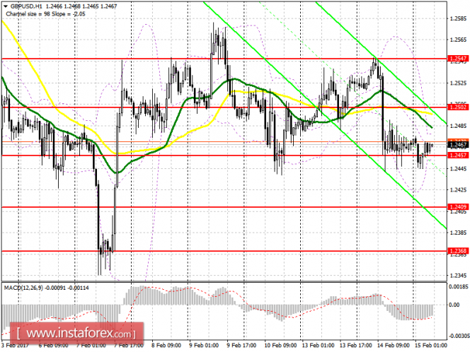 Покупатели стараются удержаться выше 1.2457, но покупать от этого уровня я рекомендую только после формирования очередного ложного пробоя, как это было на протяжении второй половины вчерашнего дня. Целью возврата будут 1.2502 и 1.2547. Более оптимальные длинные позиции советую искать после снижения GBP/USD в район поддержки 1.2409 или на отскок от 1.2368 – крупной нижней границы канала.