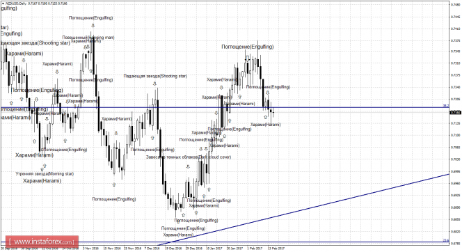 После образования медвежьей свечной формации «Поглощение» пара продолжила падение в направлении уровня коррекции 23,6% - 0,6789. Образование бычьей формации будет трендовым сигналом, так как равноудаленный канал имеет направление «вверх», и позволит рассчитывать трейдерам на разворот в пользу валюты Новой Зеландии и некоторый рост котировок. Закрепление пары над уровнем Фибо 38,2% повысит шансы на дальнейший рост в направлении следующего коррекционного уровня 50,0% - 0,7498.