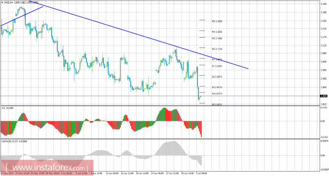 По инструменту #NG сейчас рекомендуется рассматривать шорты с целями 2,8210. Стоп-лосс выставляется выше ближайшего уровня сопротивления. Рекомендуется выставить стоп-лосс в зону безубытка при прибыльности сделки 800-1000 пунктов. Разворот наверх Awesome или OsMA может укажет на начало коррекции, как и отскок цены от 2,8210 или закрепление выше 2,8770. Ордера на покупку на данный момент не актуальны.