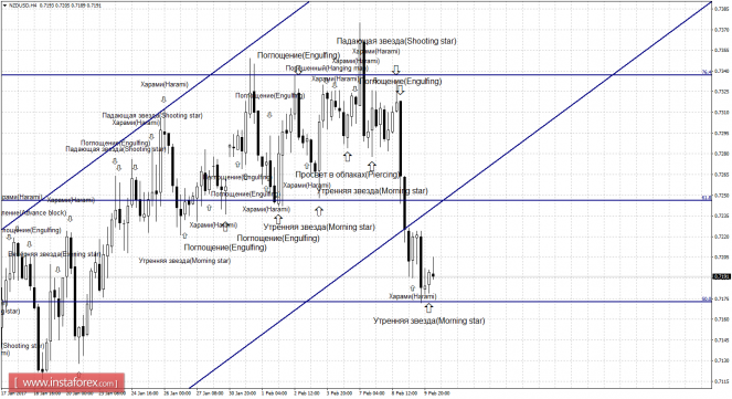 Бычья свечная формация «Харами» не позволила паре на 4-часовом графике начать рост, а чуть позже образовалась сильная бычья формация «Утренняя звезда» в совокупности с отбоем от уровня коррекции 50,0% - 0,7172. В итоге пара все-таки выполнила разворот в пользу валюты Новой Зелнадии и начала процесс роста в направлении коррекционного уровня 61,8% - 0,7246. Образование 10 февраля медвежьей свечной формации позволит трейдерам ожидать разворот в пользу доллара США и возврат к уровню Фибо 50,0%. Закрепление котировок под уровнем коррекции 50,0% повысит вероятность дальнейшего падения в направлении следующего уровня Фибо 38,2% - 0,7099.