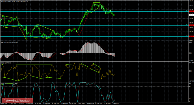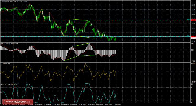 На 4-часовом графике котировки выполнили закрепление под уровнем коррекции 161,8% - 112,40. В итоге процесс падения пары может быть продолжен в направлении следующего коррекционного уровня 100,0% - 107,52. Ни одной назревающей дивергенции 9 февраля не наблюдается. Закрепление курса пары над уровнем коррекции 161,8% позволит трейдерам ожидать разворот в пользу валюты США и некоторый рост в направлении уровня Фибо 200,0% - 115,42. В последние два дня движение застопорилось.