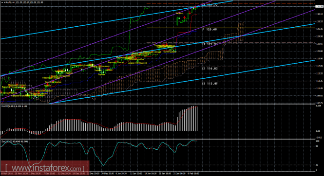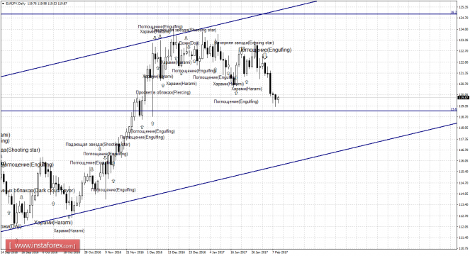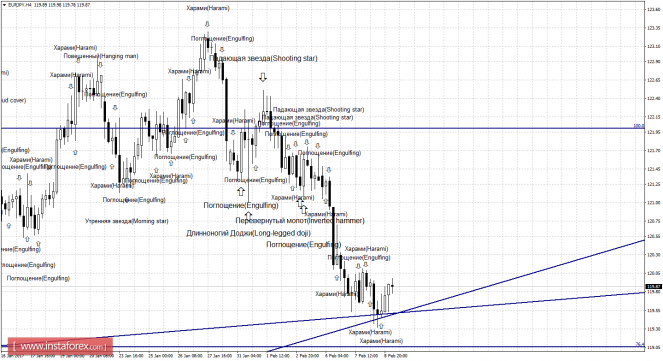 Несильная бычья свечная формация «Харами», образовавшаяся на 4-часовом графике, и отработка нижней границы равноудаленного канал еще раз приостановили падение котировок. Пара выполнила разворот в пользу европейской валюты и начала процесс роста в направлении уровня коррекции 100,0% - 122,00. Образование 9 февраля медвежьей формации позволит трейдерам рассчитывать на разворот в пользу японской иены и возобновление падения в направлении уровня Фибо 76,4% - 119,06. Такая формация будет идентифицирована как коррекционная. Закрепление курса под уровнем коррекции 76,4% сработает в пользу продолжения падения в направлении следующего уровня Фибо 61,8% - 117,24.